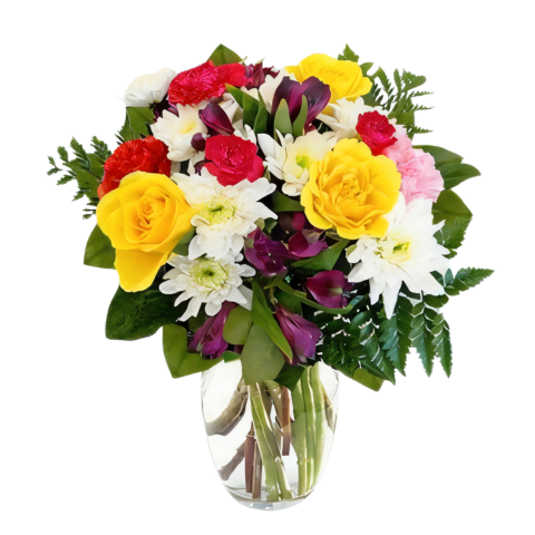 This colourful bouquet is truly delightful. Pretty yellow Roses, bright white chrysanthemums and striking Carnations are interspersed with long lasting spray Carnations and gorgeous purple Alstromeria set off with rich green Salal leaves.